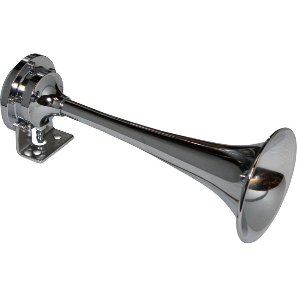 Osculati single trumpet horn made from chrome plated brass. This horn is suitable for 12V systems and features a 123dB horn. The air horn is supplied with a compressor and mounting kit.