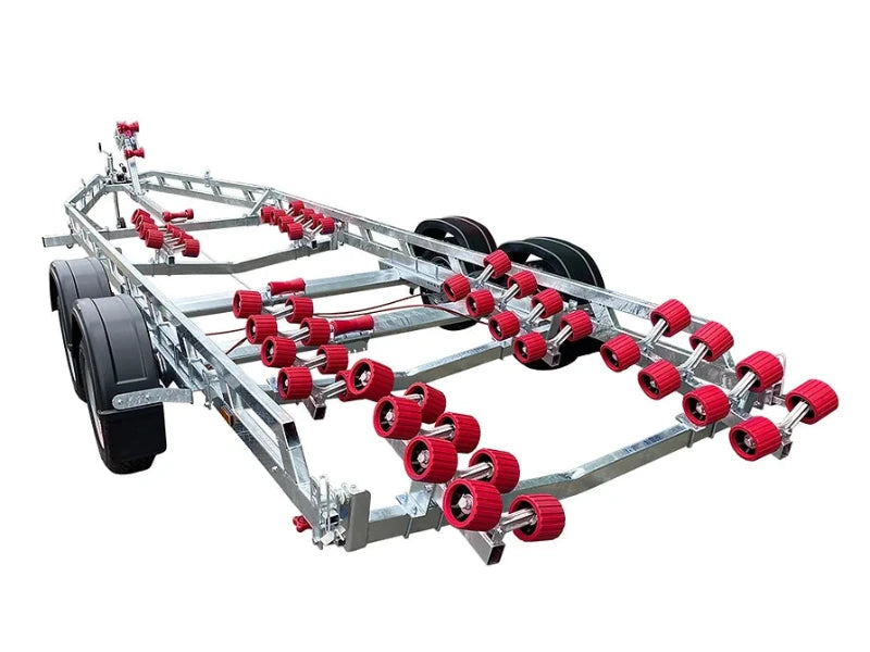 Everything on this trailer is adjustable, so it can fit most hull shapes. Overall length: 8.0m. Overall width: 2.39m