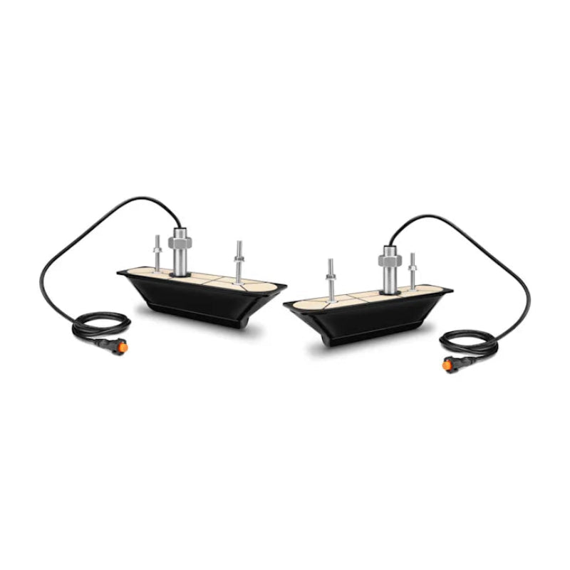 Includes 12-pin port and starboard transducers with stainless steel stems, isolation bushings, fairing blocks, Y-cable, mounting hardware and installation instructions. Follow the instructions carefully to avoid damaging your boat.