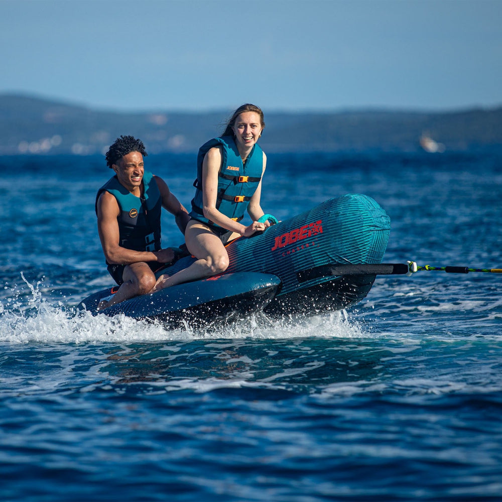 The Chaser 2 person towable is a serious towable to ride with a friend or family member. Its tough 840 nylon double-stitched cover protects the 28 gauge PVC-base and the tube from damaging. Hold on tight to its comfy and super strong nylon-wrapped handles with luxurious neoprene knuckle protection. Features a one way valve and quick connector for convenience.