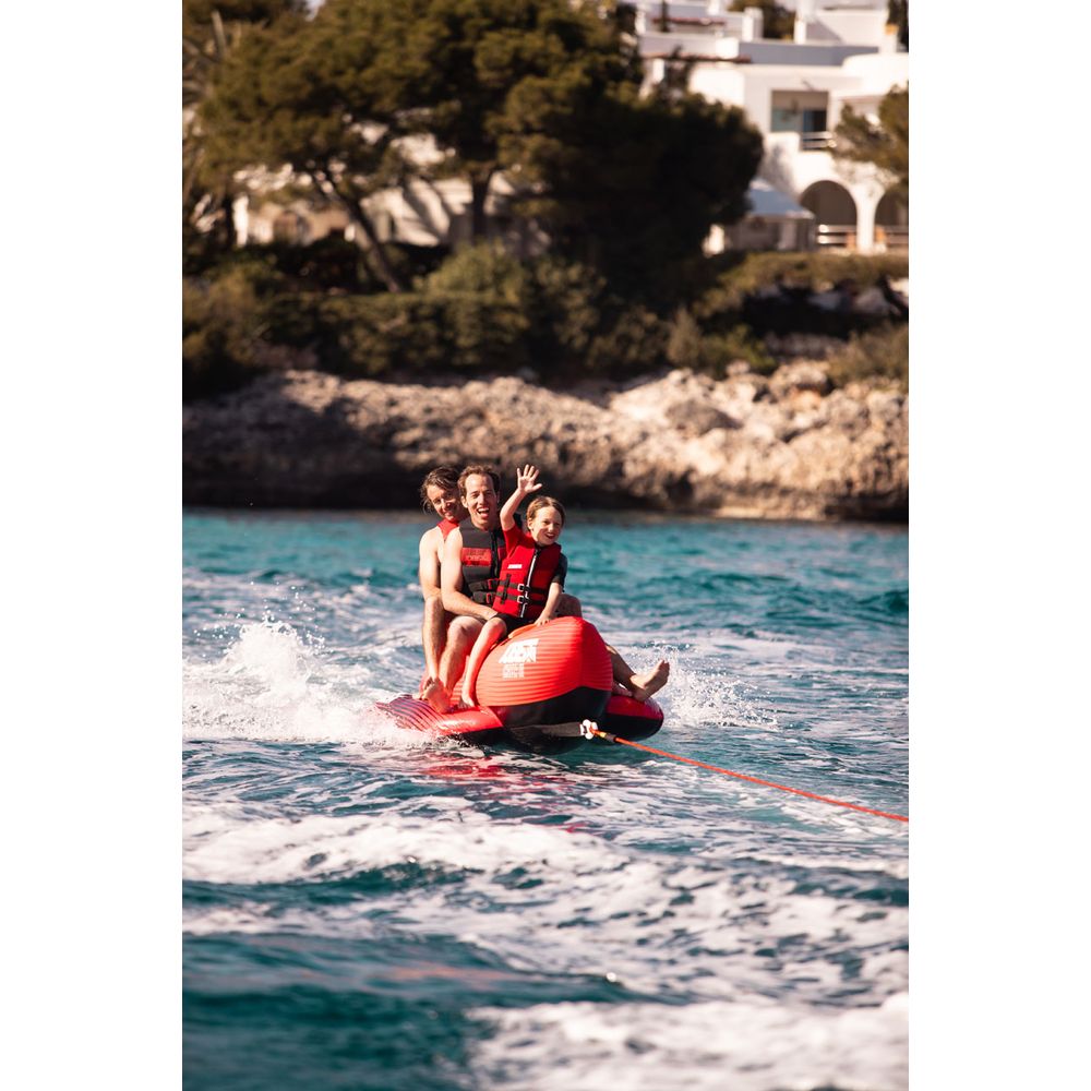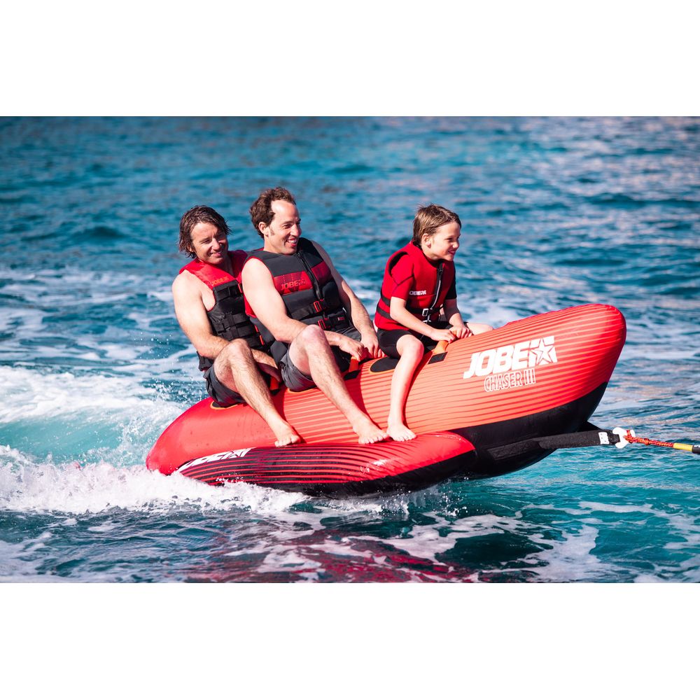 Be a fool and climb on the 3 person Chaser of Jobe to have the time of your life. This towable is a serious towable to ride with a friend or family member. Its tough 840 nylon double-stitched cover protects the 28 gauge PVC-base and the tube from damaging. Hold on tight to its comfy and super strong nylon-wrapped handles with luxurious neoprene knuckle protection. Features a one way valve and quick connector for convenience.