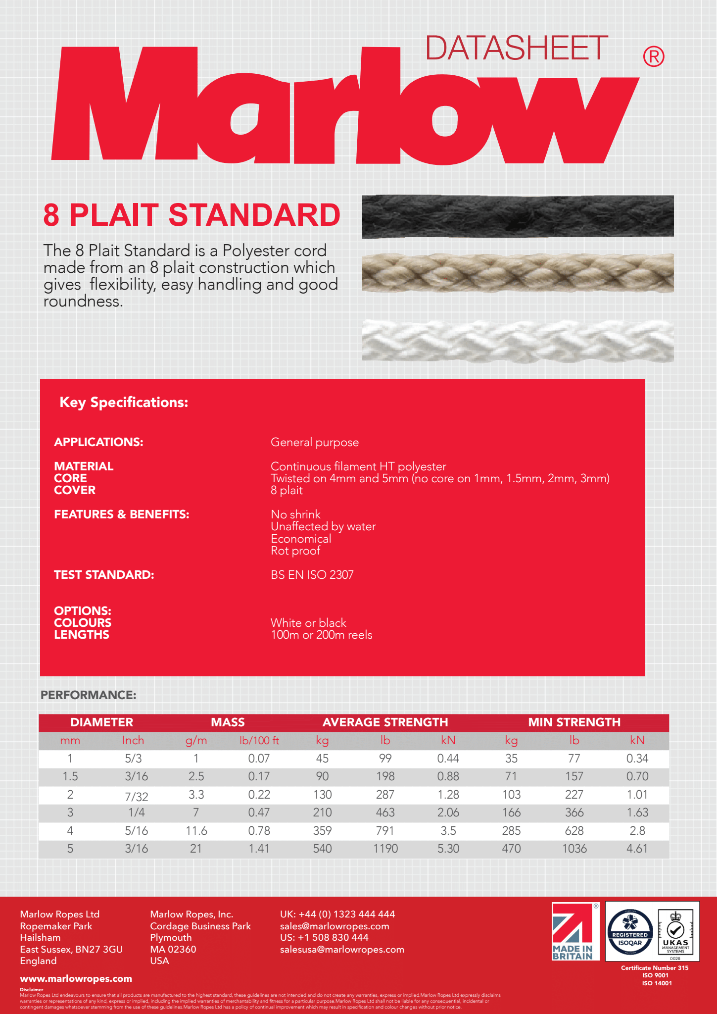 High quality 100% polyester line for flag halyards and burgees. Also used as leach lines, and for whipping large diameter ropes as well as decorative lashings. 8 plait construction is flexible, easy handling and retains good roundness.