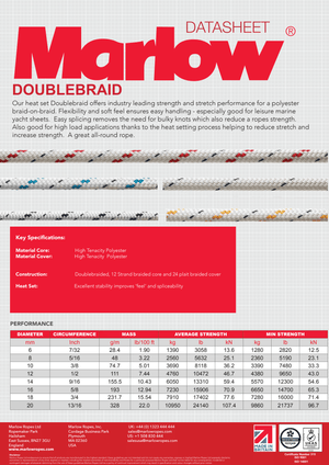 Marlow`s heat set Doublebraid offers industry leading strength and stretch performance for a polyester braid-on-braid. Flexibility and soft feel ensures easy handling - especially good for leisure marine yacht sheets. Easy splicing removes the need for bulky knots which also reduce a ropes strength. Also good for high load applications (halyards) thanks to the heat setting process helping to reduce stretch and increase strength.
