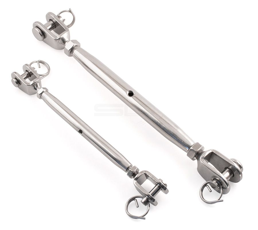 Also known as a tension screw or a turn buckle, these fasteners are used to adjust and tighten loads, allowing increased tension between two components. Often used in marine, sailing, boating and industrial applications.