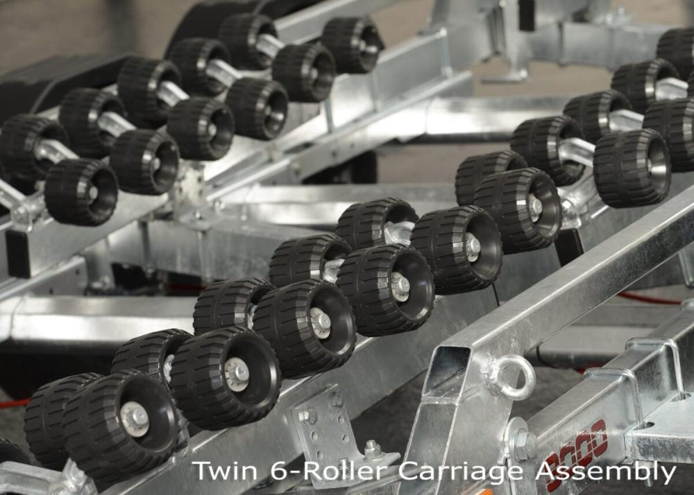 - Forward cranked swing beam cross member fitted with twin rocker carriages and 12 rollers a side. 24 in total.