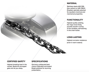 Besides Ultra Marina products we offer also stainless steel chain made in Germany from best quality stainless steel. Sizes are from 6 mm up to 13 mm and in ISO or DIN norm. You can also chose from stainless steel quality Grade 60 (AISI 316 L), Grade 60 PLUS (AISI 318 LN Duplex) and Grade 60 PLUS (Superduplex A182 F61). All chains are tested, calibrated and bright polished. Stainless steel chains help match our Ultra Anchors and Swivels the best way and having stainless steel chain helps you to store your chain in your locker and there is no need of re-galvanization in the future
